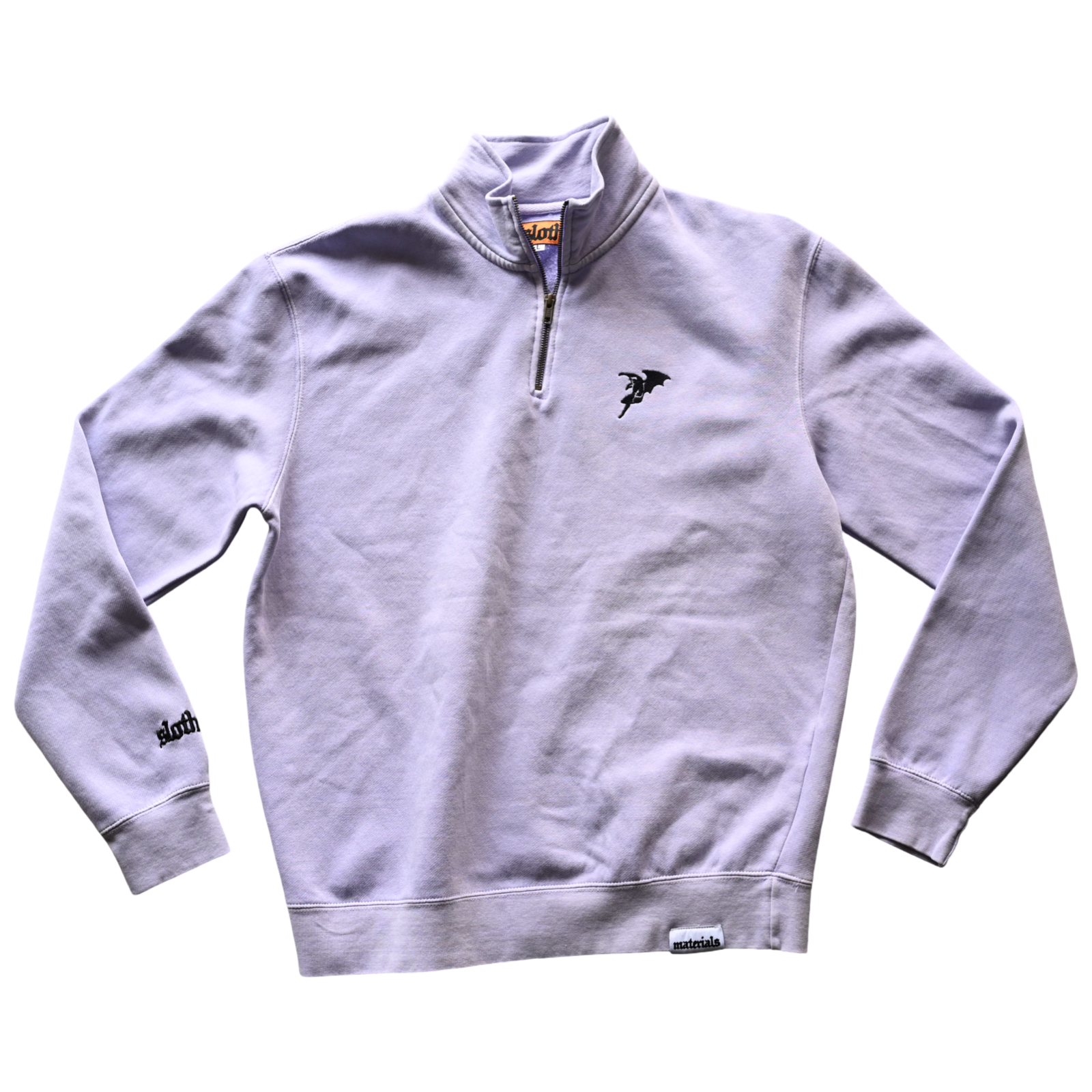 The Pigment Dyed Quarter Zip with the 'Daemon' Logo embroidered on Left Chest and Sloth Text embroidered on sleeve.