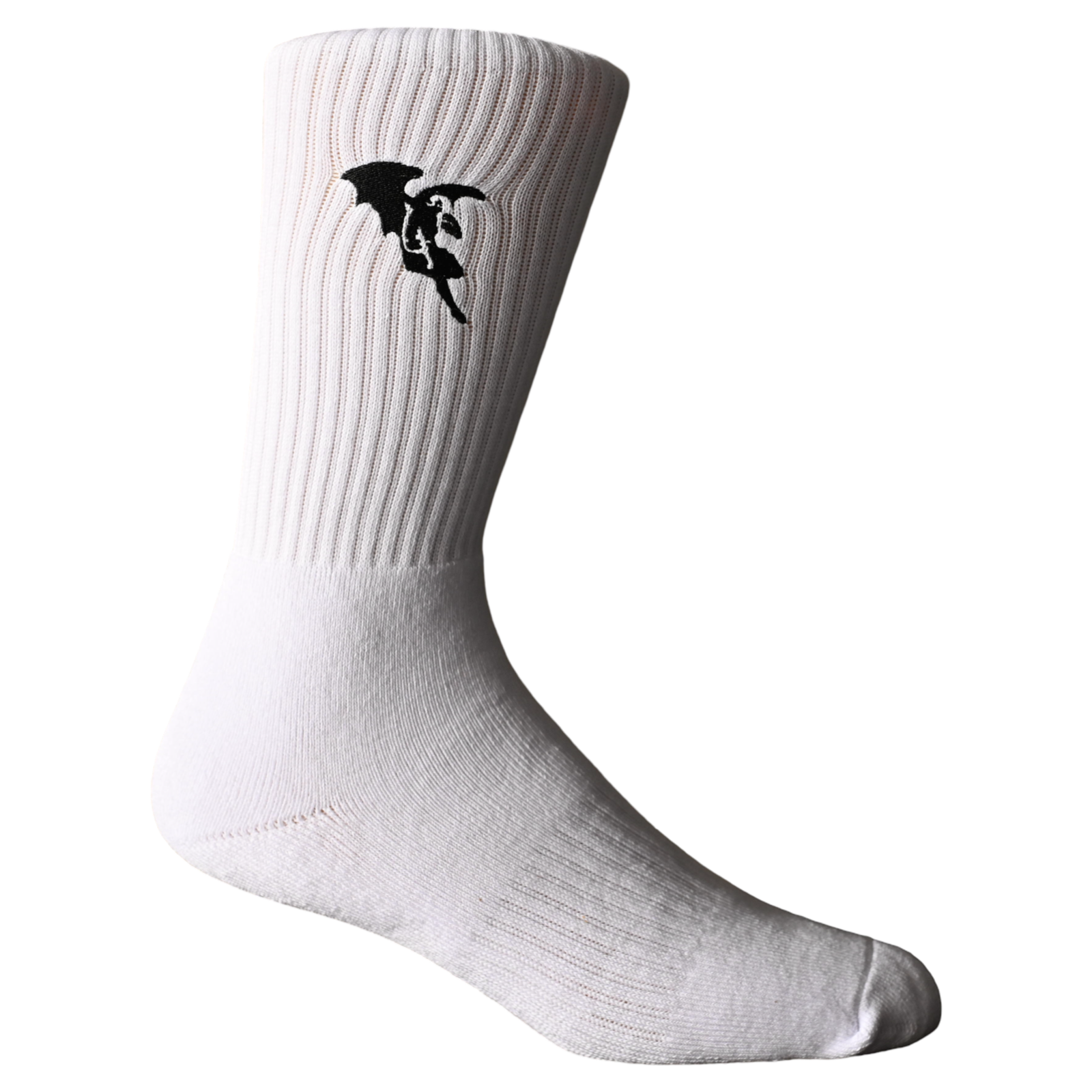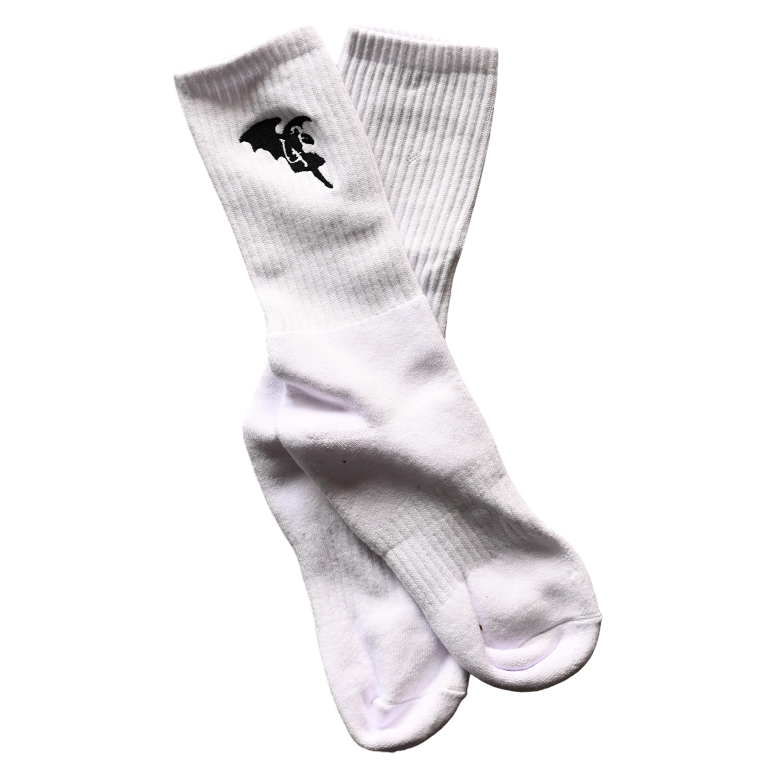 The ‘DAEMON’ crew sock in WHITE with a BLACK embroidered logo.