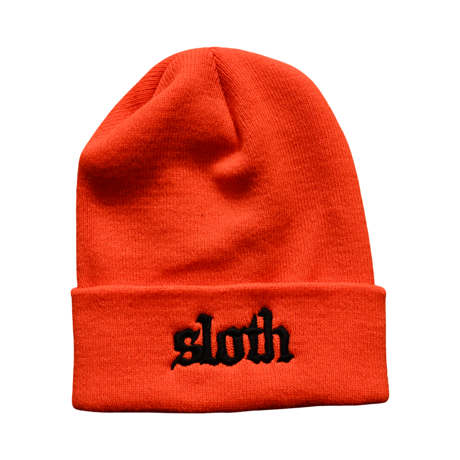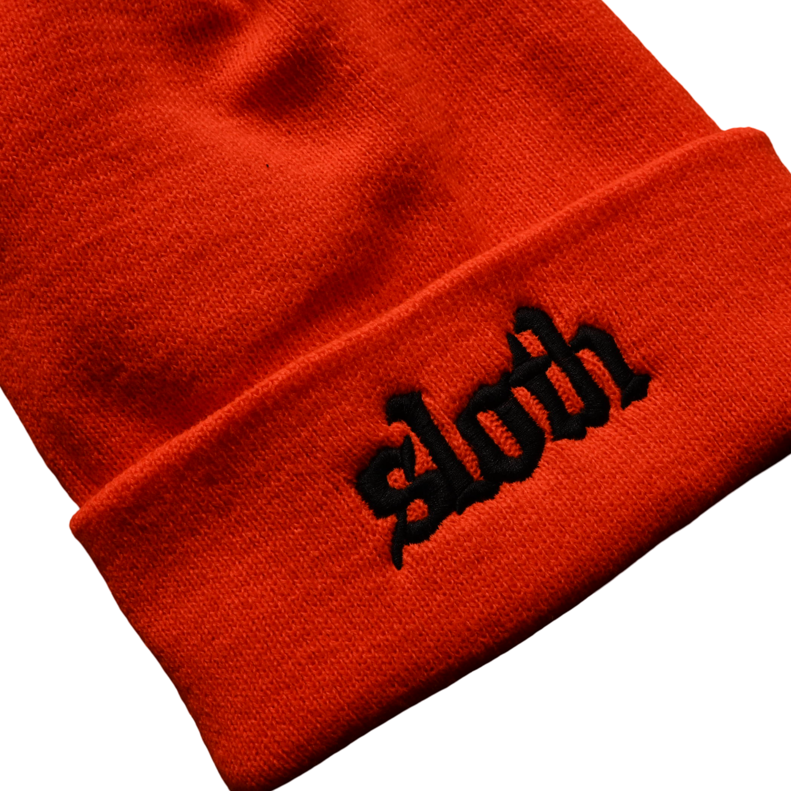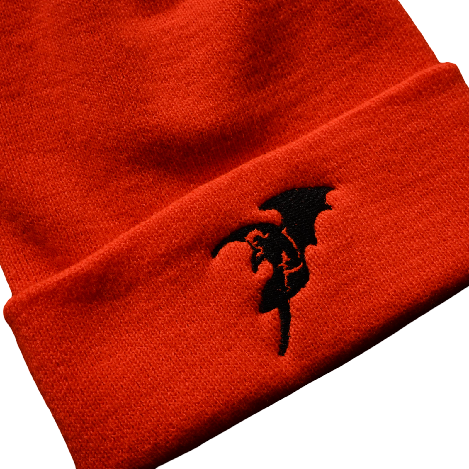 This is a tight knit beanie with a cuff and black embroidered logos.